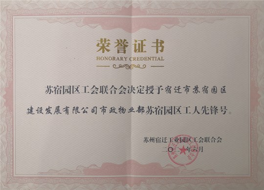 近日,建發(fā)公司市政物業(yè)部被蘇宿園區(qū)工會聯(lián)合會授予“蘇宿園區(qū)工人先鋒號”榮譽稱號。