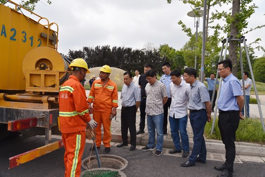 此次演練模擬園區(qū)連續(xù)普降暴雨,同里湖路部分道路出現(xiàn)嚴(yán)重積水,影響通行。接到險情匯報,園區(qū)立即啟動防汛應(yīng)急預(yù)案,公司應(yīng)急搶險組迅速趕到現(xiàn)場,放置警示標(biāo)志提醒車輛行人繞道通行。隨后根據(jù)現(xiàn)場查勘迅速制定排水方案,首先使用防汛應(yīng)急泵車抽排路面積水,隨后對積水路段管道進(jìn)行緊急疏通,最后采用CCTV檢測技術(shù)查明堵塞原因并制定后續(xù)維護(hù)方案。整個演練過程人員分工明確,搶險反應(yīng)迅速,環(huán)節(jié)銜接流暢。
