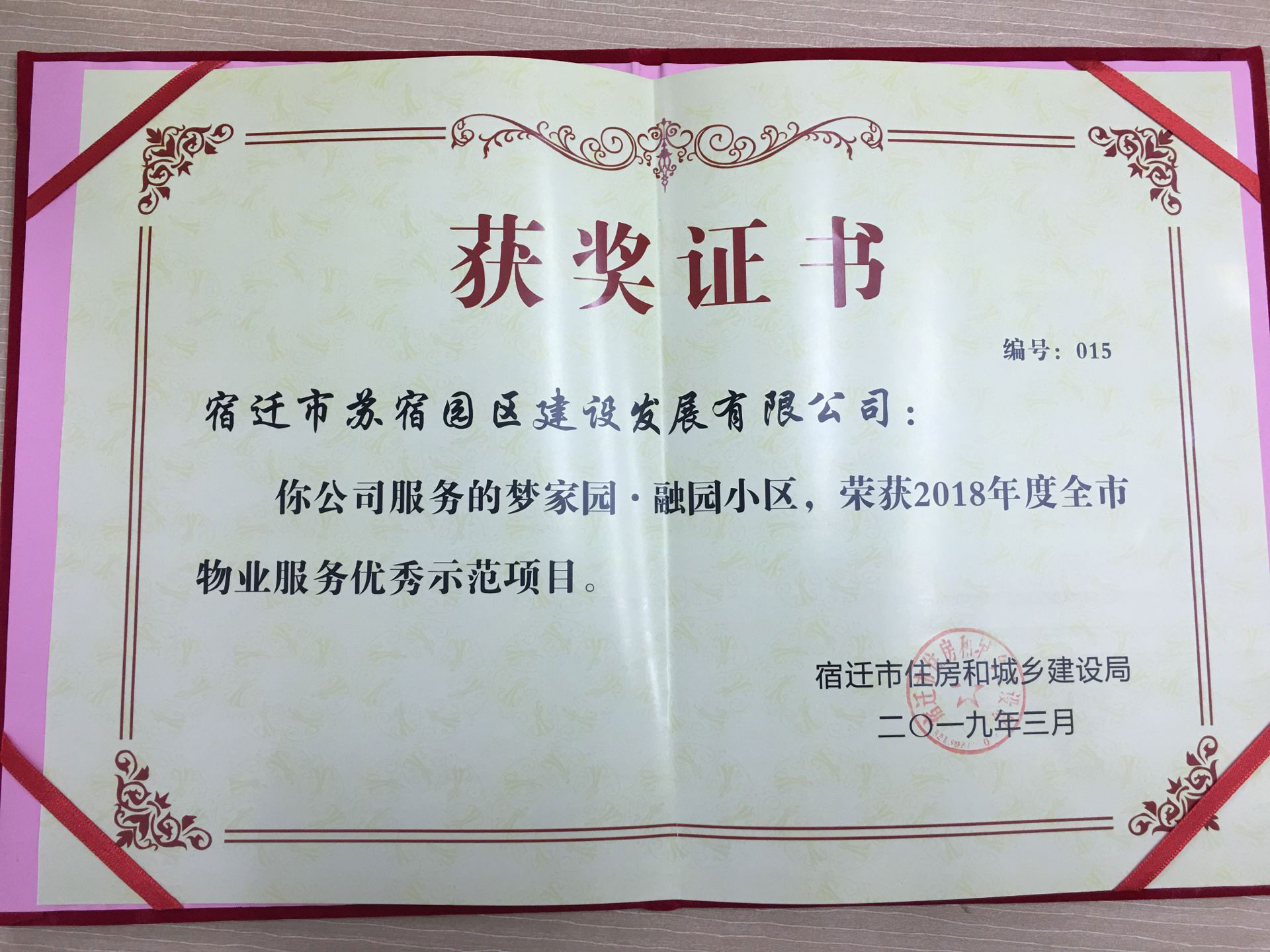 2018年12月,在宿遷市房管局及市物業(yè)管理協(xié)會組織的全市物業(yè)管理項目考核評比活動中,夢家園.融園喜獲“2018年度全市物業(yè)服務(wù)優(yōu)秀示范項目”。